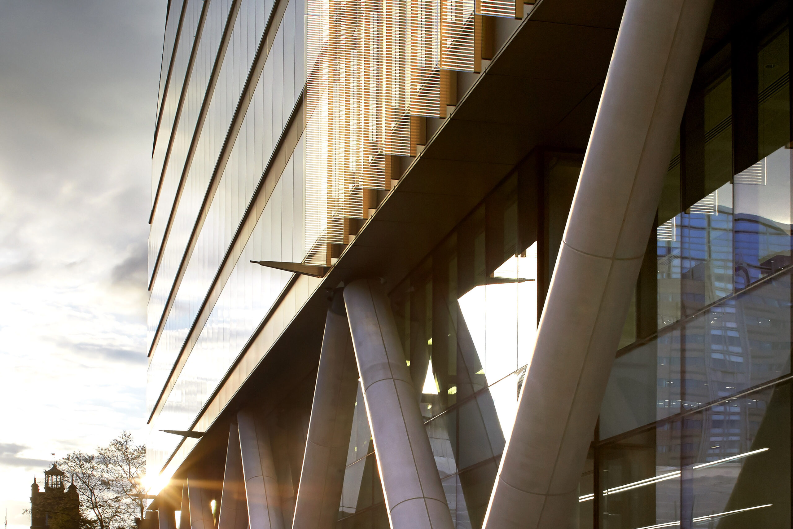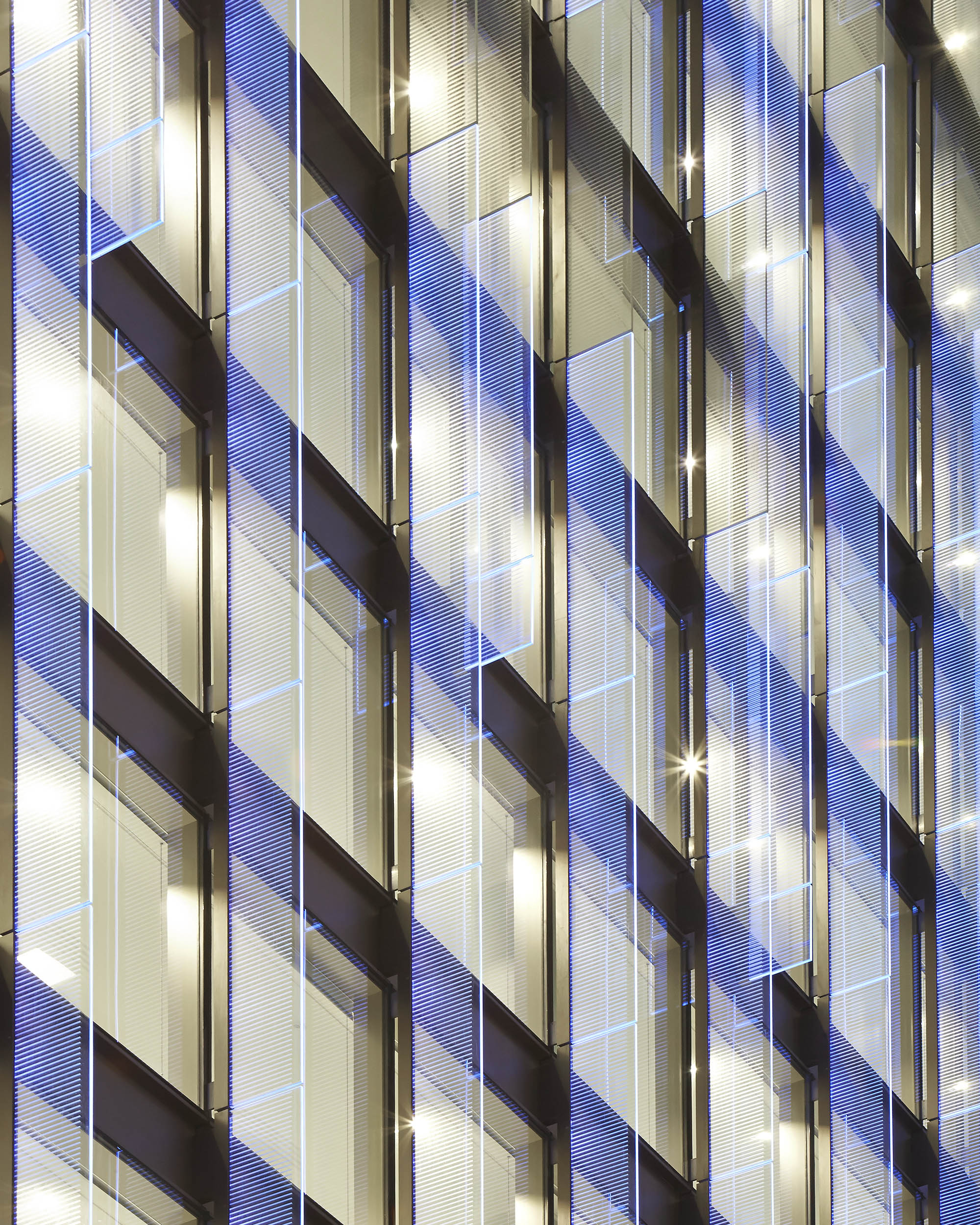 A unitised glazing system wraps the building, optimised for daylight and energy control. On the east and west façades, vertical bronze-anodised fins provide solar shading while introducing a vertical cadence that reflects the building’s structural rhythm. These fins also enhance depth and articulation, creating subtle shifts in perception as light conditions change throughout the day.