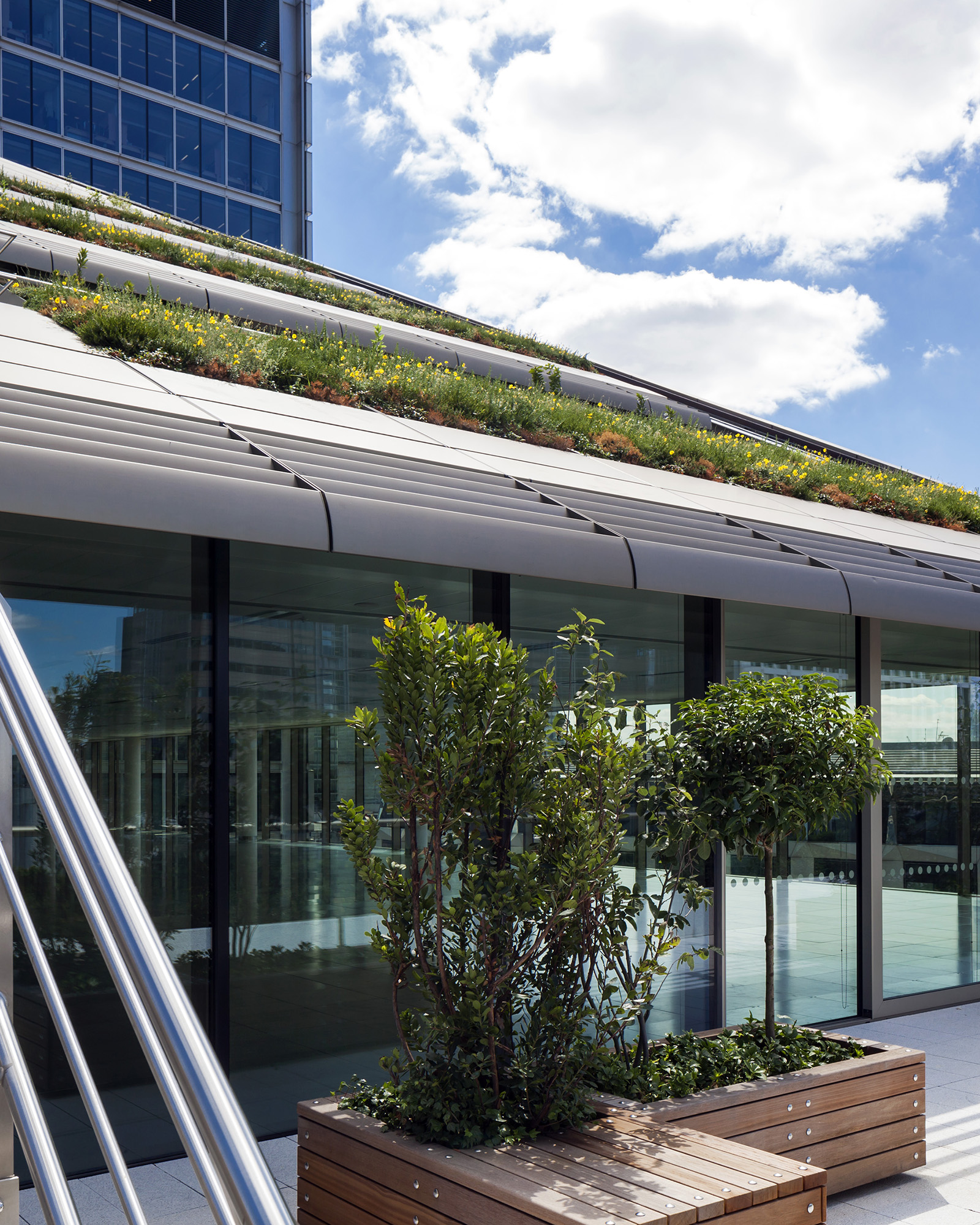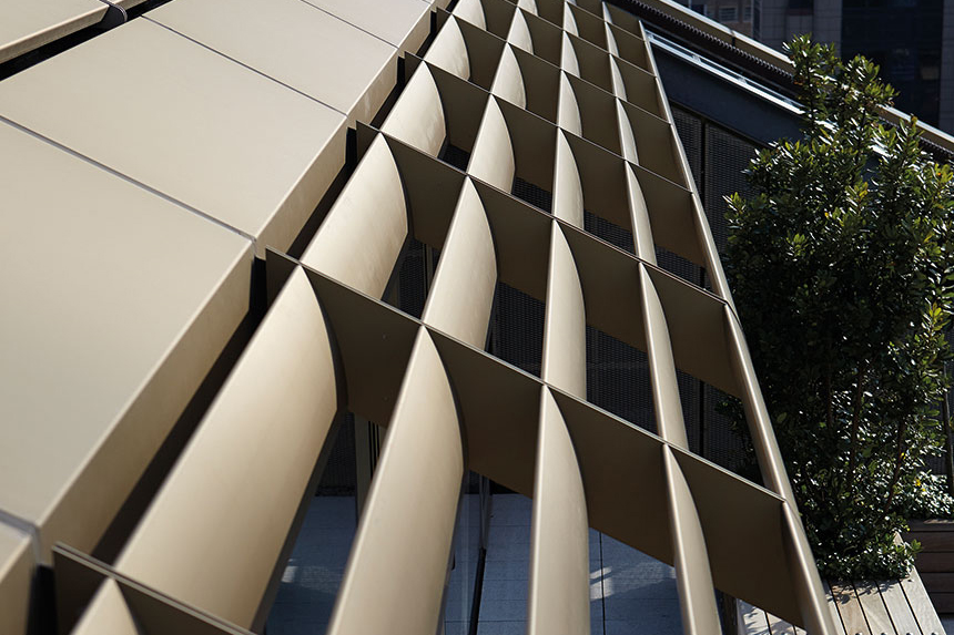 The landscaped terraces continue the facade’s language upward. Glazed balustrades and bronze mesh panels extend the visual rhythm vertically, while integrated planting softens the massing and strengthens the connection between the building and its surroundings.