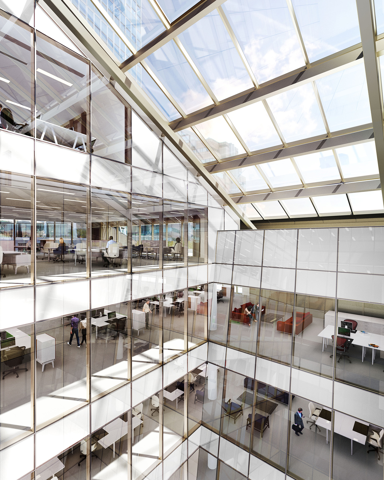 Internally, the building delivers twelve levels of flexible workspace arranged around a compact central core. Typical floorplates span 15.5 metres, supporting a wide range of tenant configurations, from single-occupier headquarters to co-working environments. A full-height atrium brings natural light into the centre of the plan and provides a visual anchor that enhances orientation and experience.