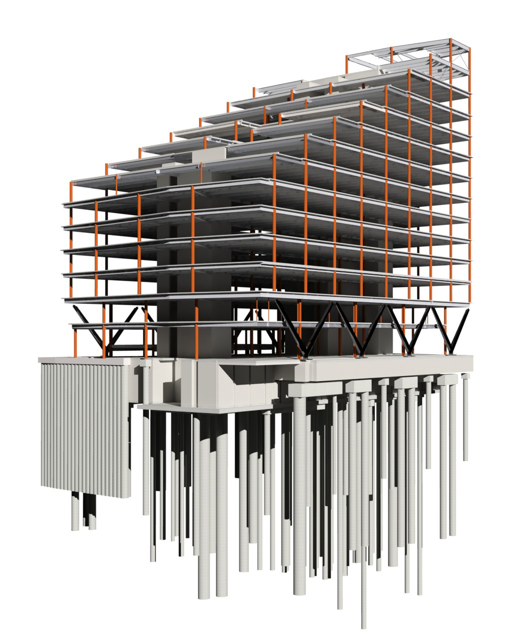 deep service corridors, and a compact, irregular footprint. In response, the structural strategy was developed not simply