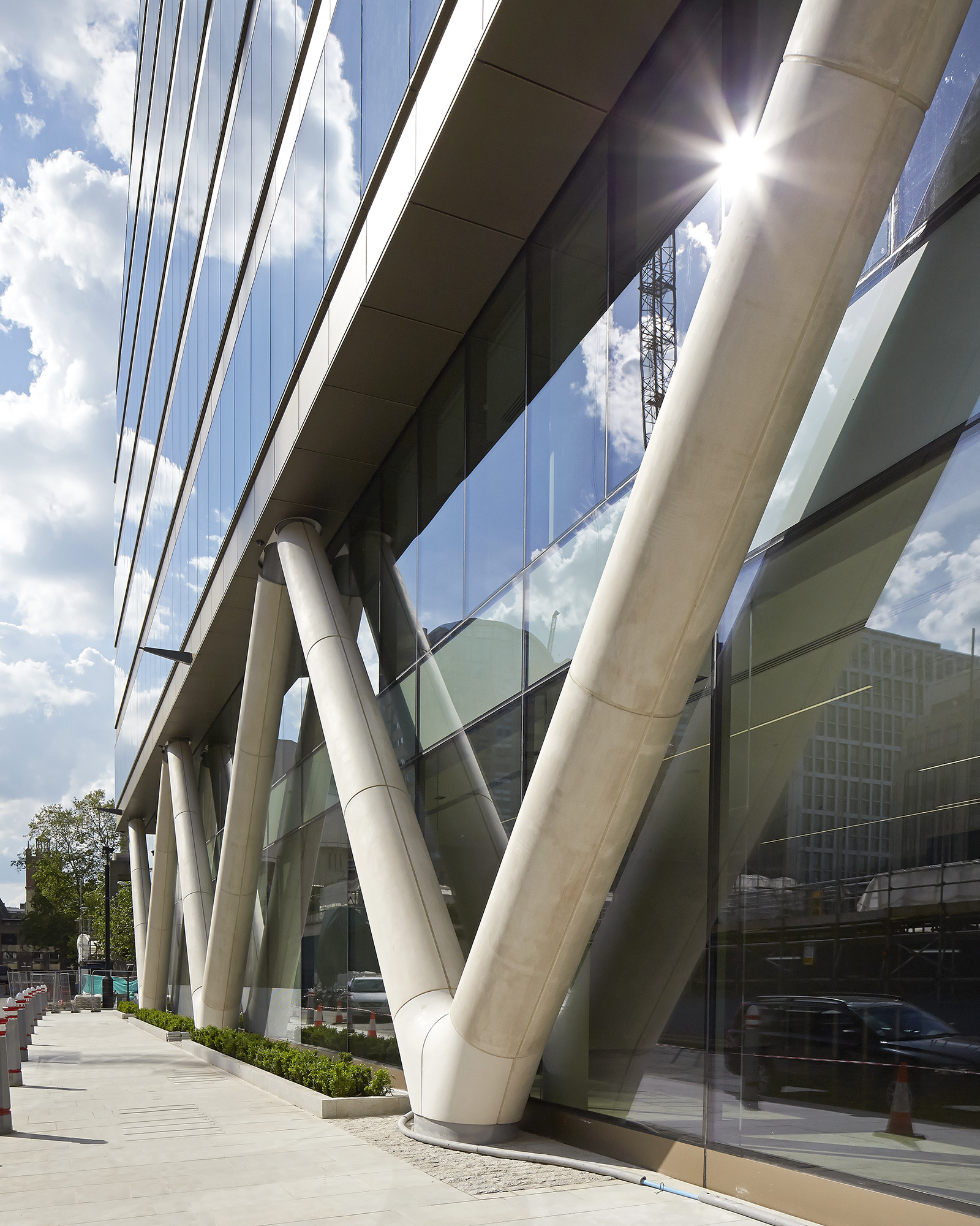 A rhythmic sequence of V-shaped perimeter columns anchors the building at street level, guiding structural loads away from sensitive zones below while lending a distinctive identity to the façade. These sculptural supports bring both performance and presence—framing the Fore Street frontage with a sense of material clarity and calm precision.