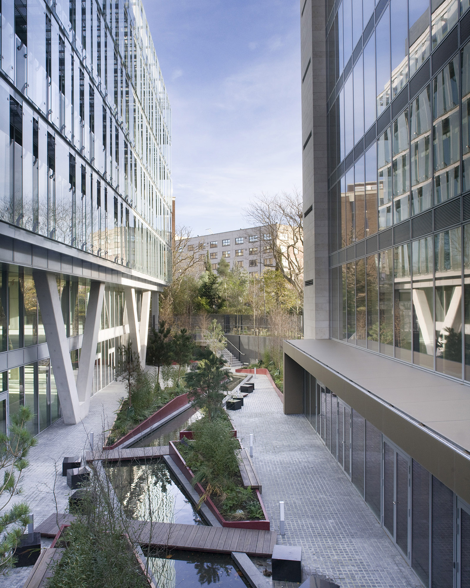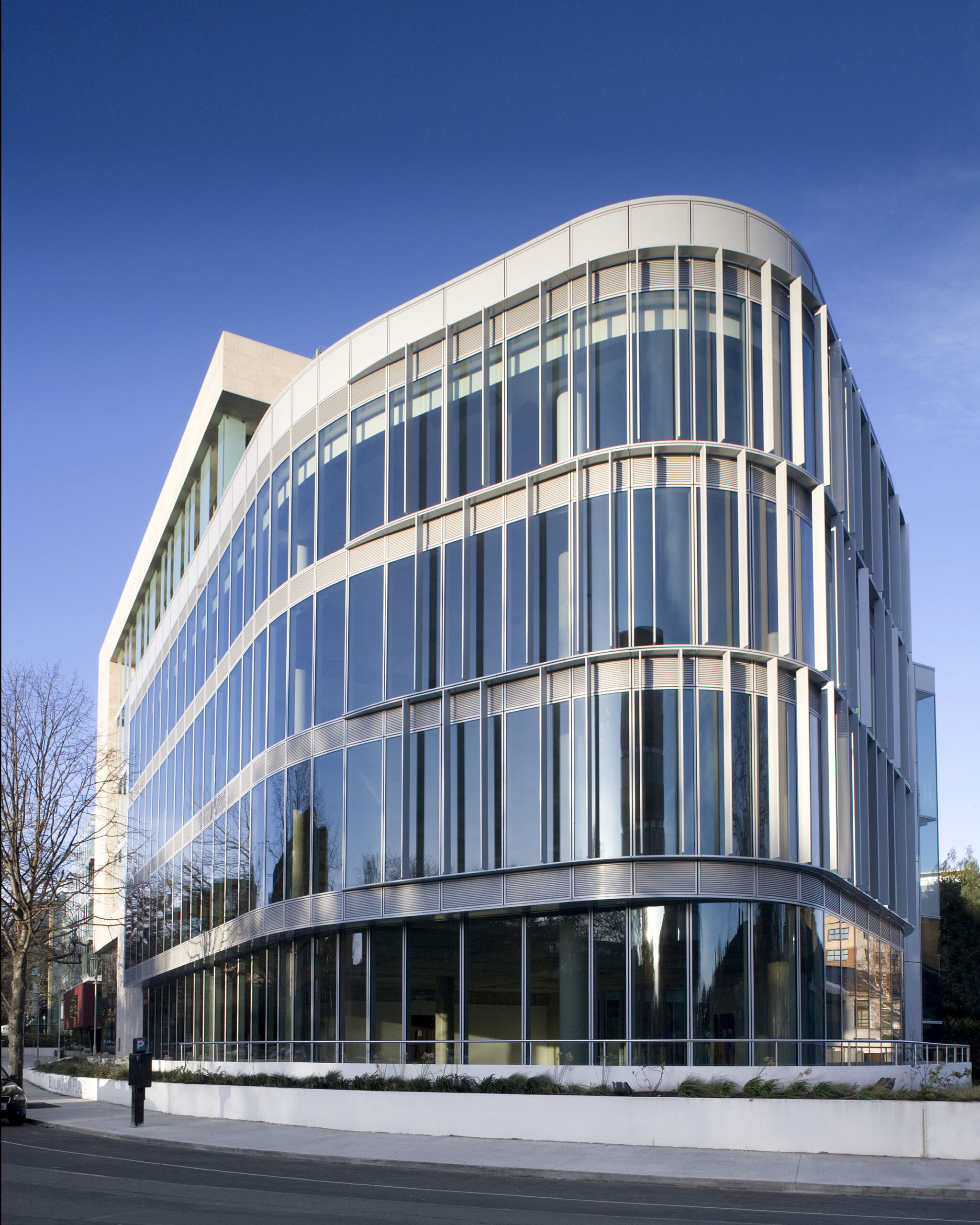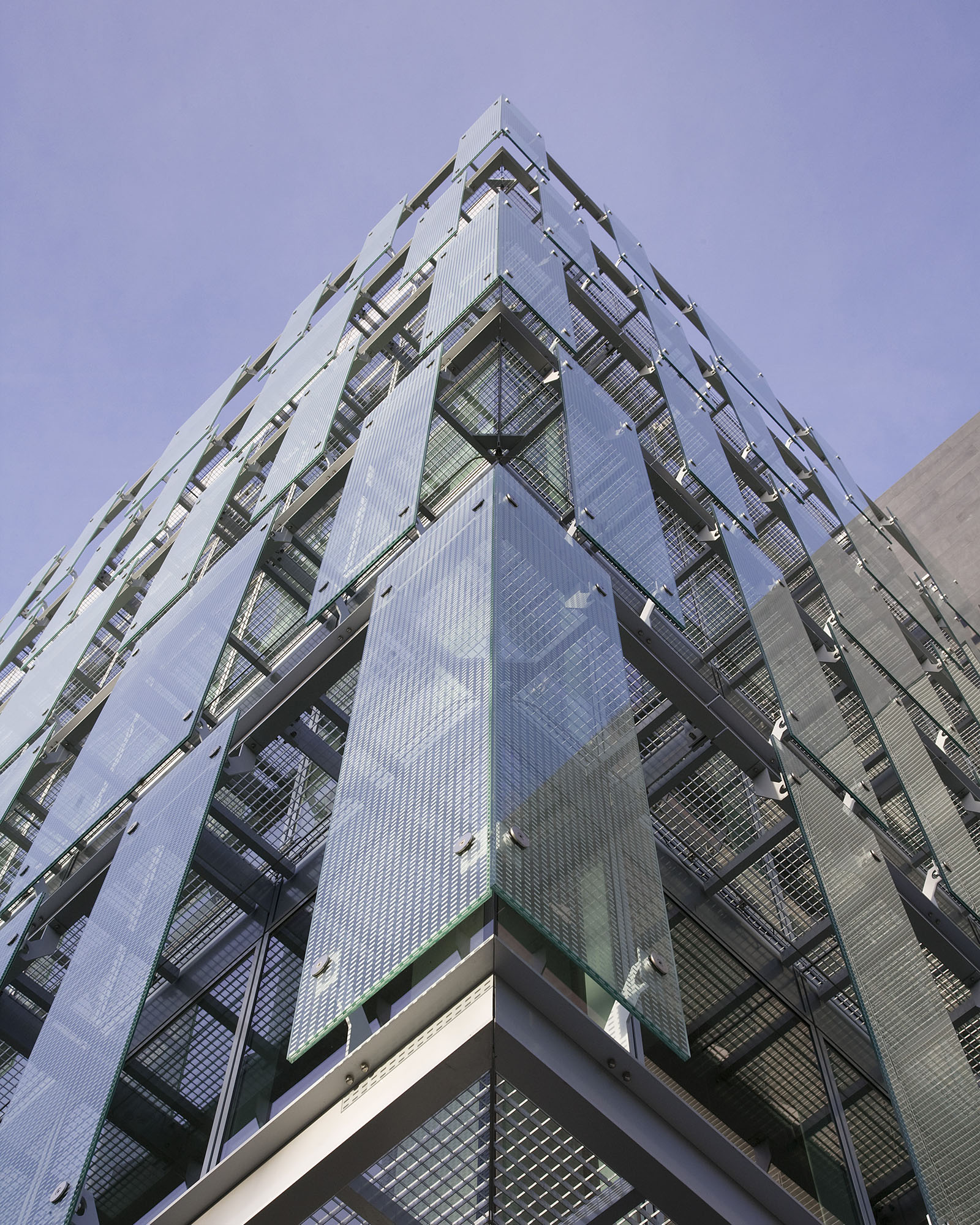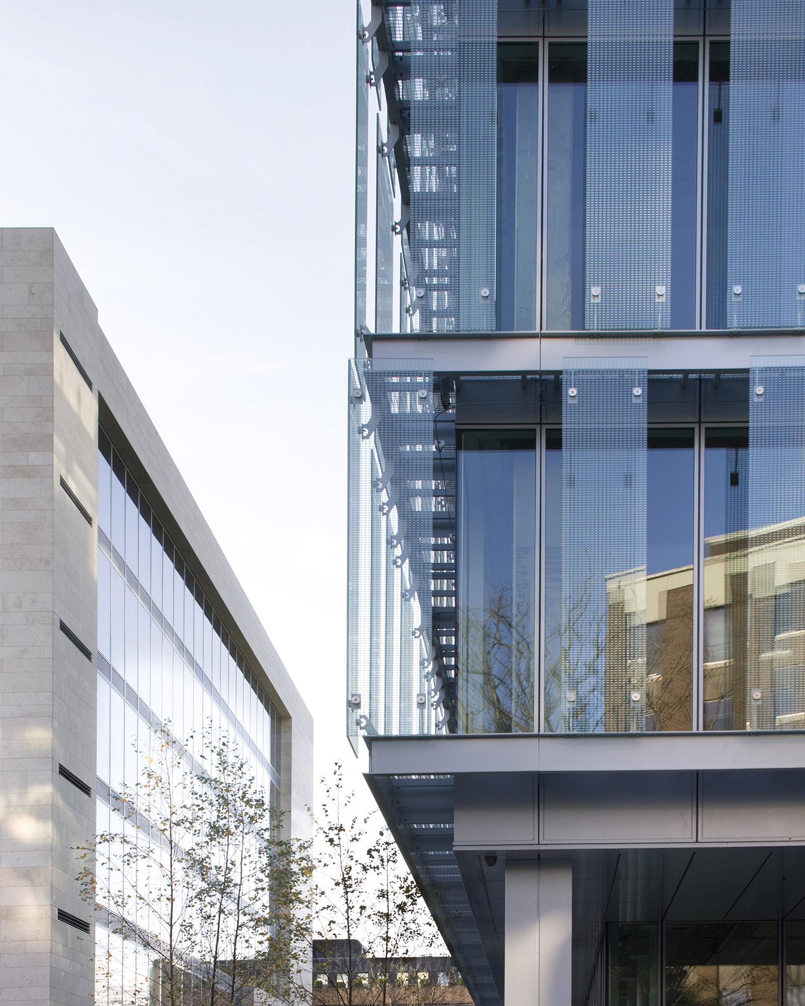 Energy efficiency was central to the design philosophy of Burlington Plaza. A combination of triple-skin façades, fritted glass, and angled aluminium fins provide passive solar control,reducing reliance on mechanical heating and cooling. Chilled beams throughout both blocks further enhance occupant comfort while lowering operational costs and carbon output. Greywater recycling and careful orientation strategies reinforce the environmental agenda, positioning the project as a benchmark for sustainable office design in Ireland.