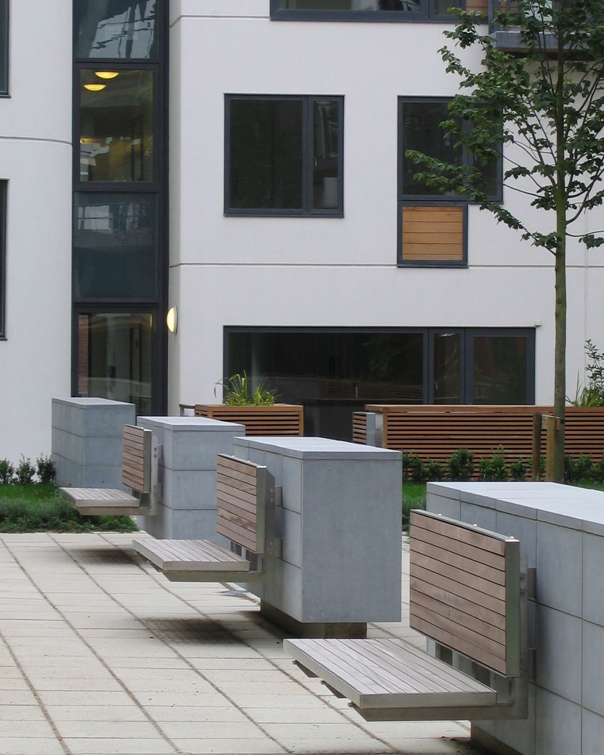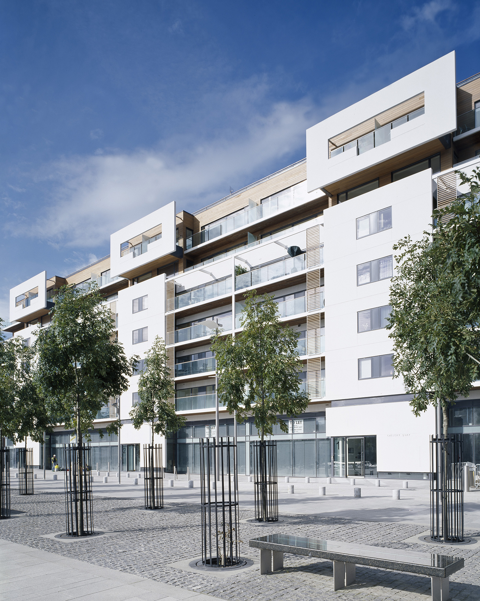 Completed in 2005, the €63 million project comprises 300 apartments arranged in a mix of one, two, and three-bedroom units, including duplex family homes and social housing. HKR’s design is organised around two landscaped private courtyards and a newly created public street, establishing both intimacy and connectivity within the urban block. At ground level, retail units and a café add activity and permeability, while double-height entrances create a sense of arrival and community. Material clarity underpins the architecture, with stone, render, aluminium, and timber expressed in clean modern lines, complemented by cedar detailing at penthouse level. Distinctive roof gardens offer panoramic views across Dublin, providing valuable private amenity space in a dense city setting. Gallery Quay combines urban presence with liveability, shaping a model for sustainable city-centre living.
