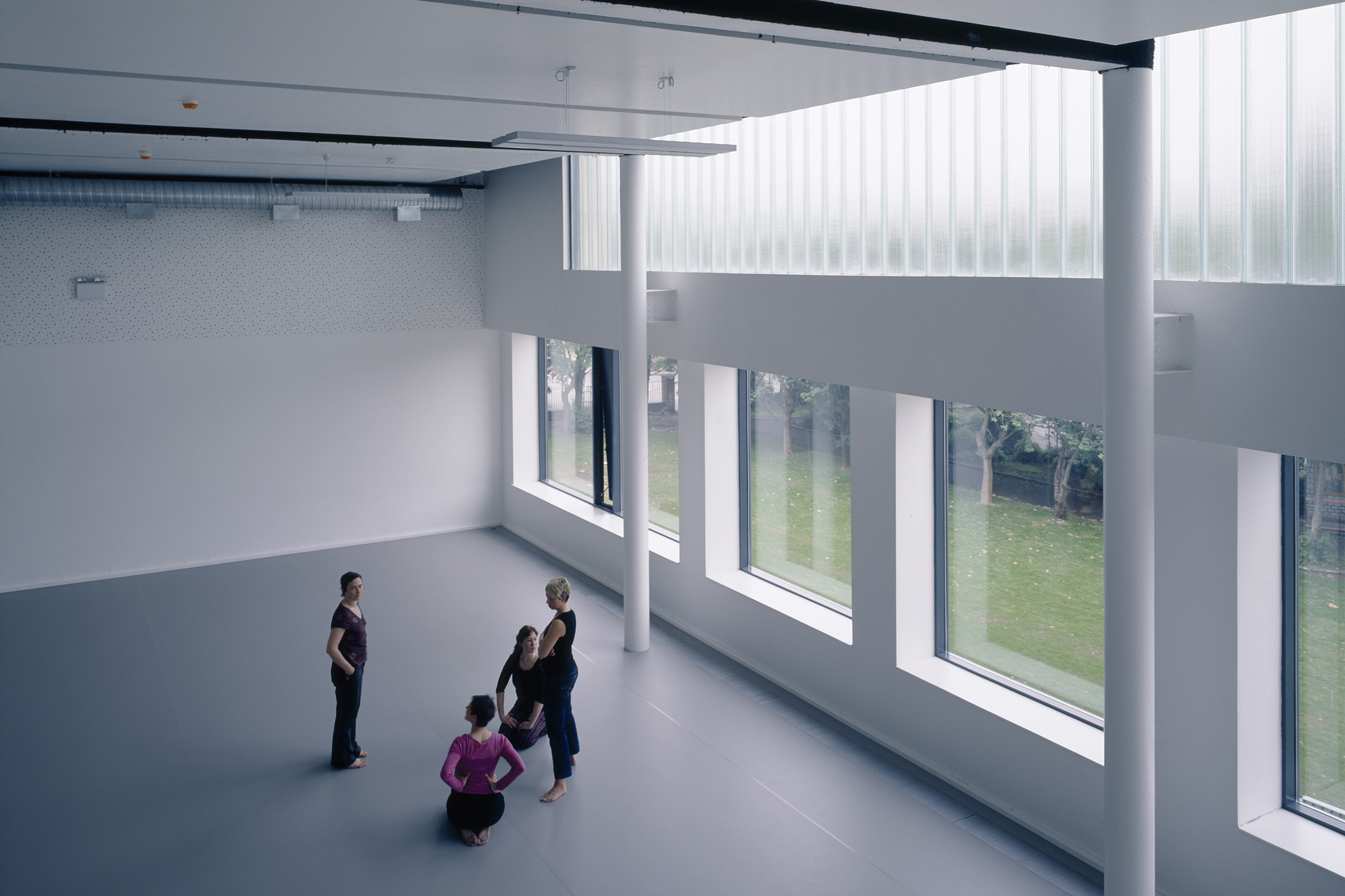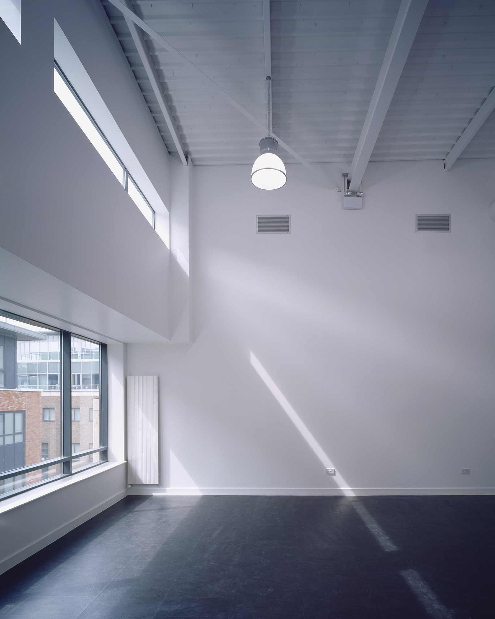 The Arts Centre is known as ‘The Lab’ and contains a large double height ground floor exhibition space, large flexible studio spaces, specific artists’ studios and administration facilities.